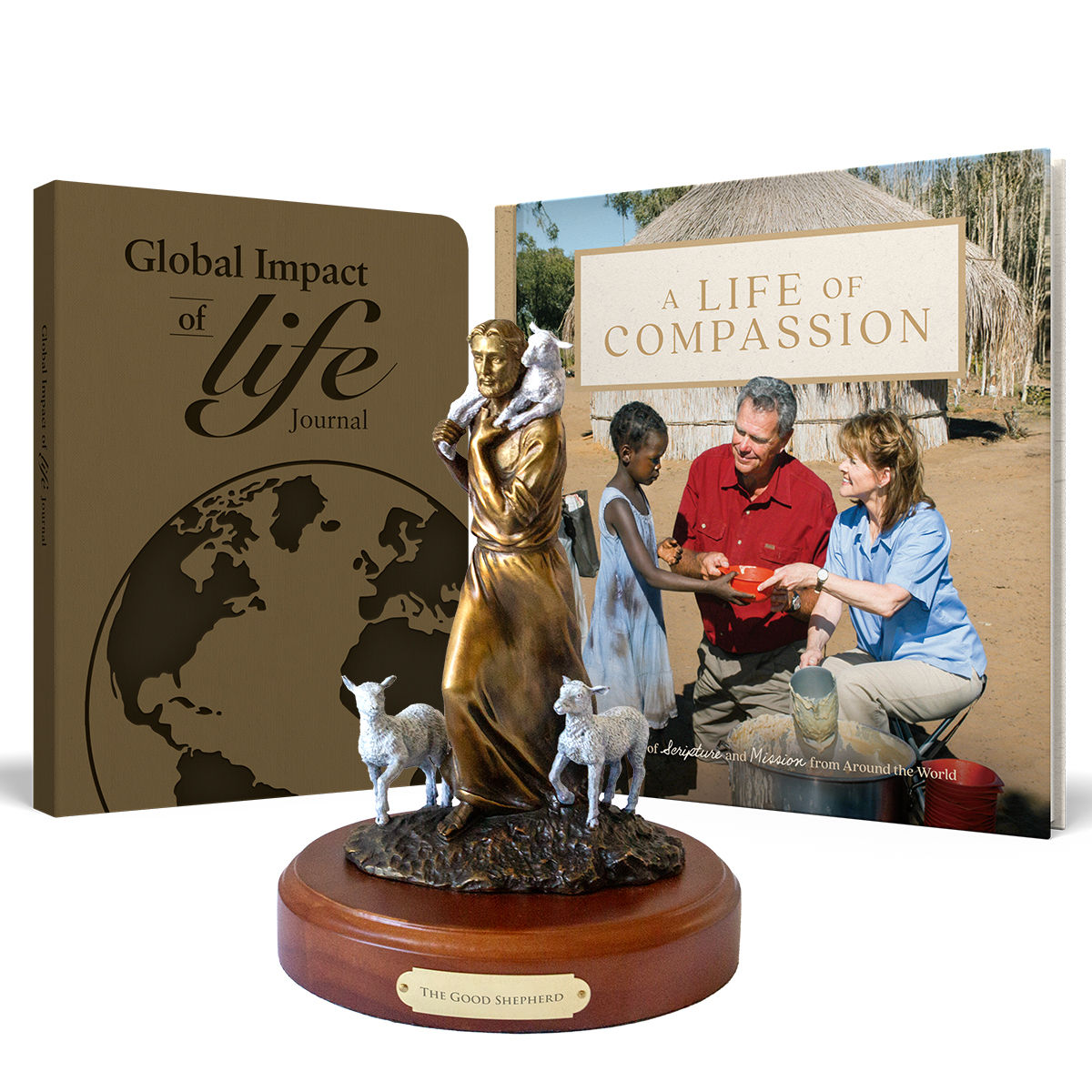 The Good Shepherd bronze/ A LIFE of Compassion book/ The Global Impact of Life journal